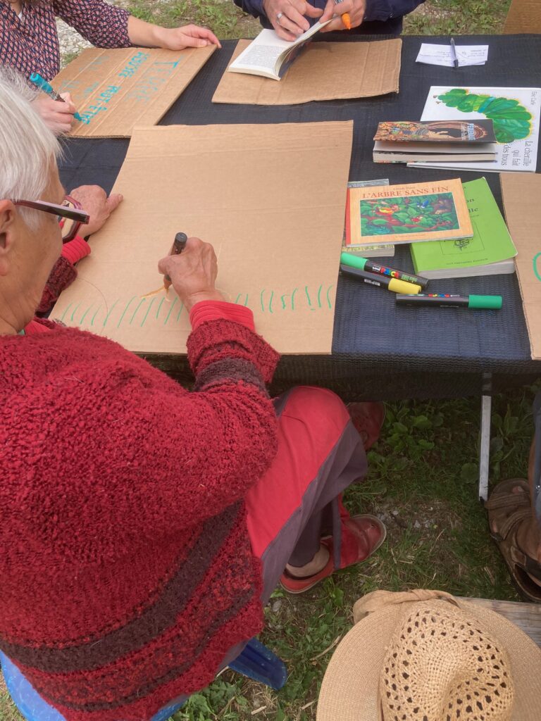 Chacun.e prend un temps avec un livre qui donne envie et on cherche des slogans pour notre révolte paysanne. Certains viennent directement se greffer des pages à nos cartons. D’autres sont inventés sur place ou réfléchis depuis longtemps :
