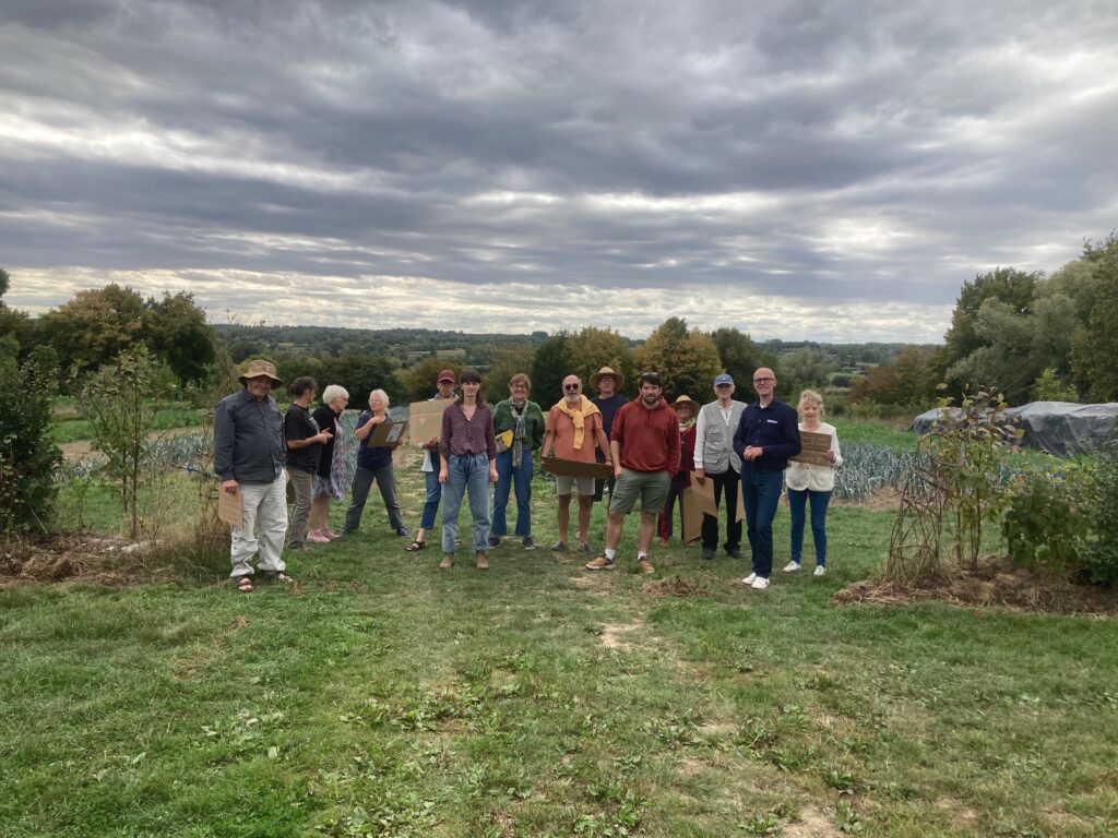 On finit la manif’ avec un sitting en silence face au paysage. Et on adresse la manif’ à Lola qui nous a invité sur sa ferme et vend des légumes aux clients de passage pendant la durée de l’atelier.