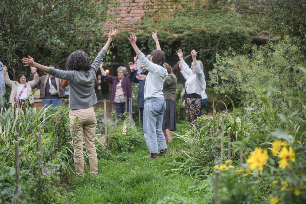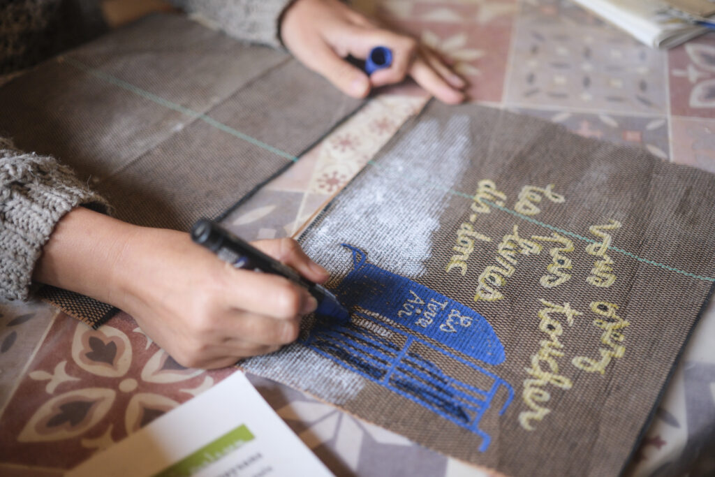 On prend le temps de reprendre la chorégraphie de la manifestation et de se regarder vivre dans ce lieu magique qui fait rêver. Puis le groupe repart et on prend du temps autour de la table avec les personnes qui restent en se lisant des phrases, avant de poser des mots et des images sur des bouts de bâches découpées pour le carnet de bord.