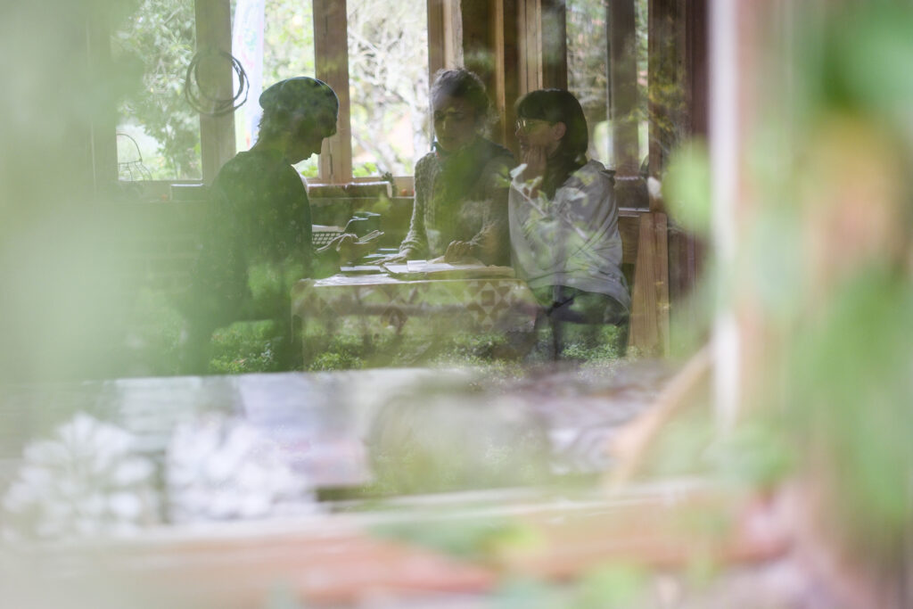 On déjeune ensemble et on se raconte nos vies entre bout de pain brioché et fromage de chèvre ‘fait maison’ aux deux extrémités de la pièce d’accueil.