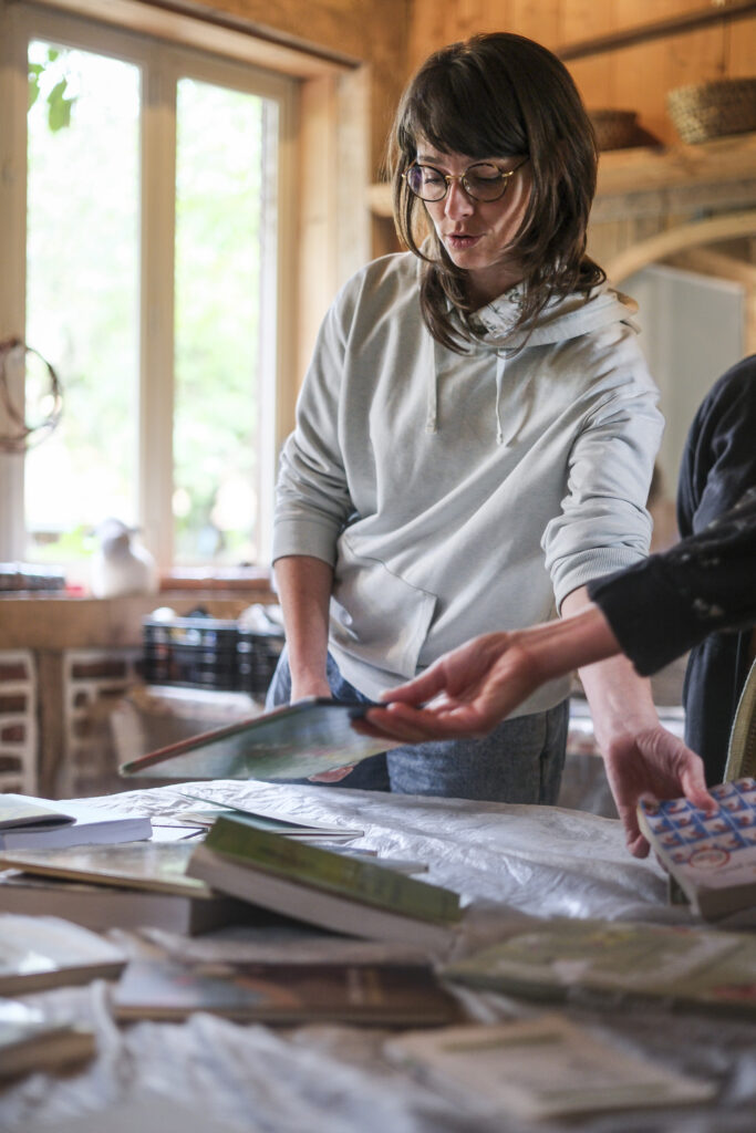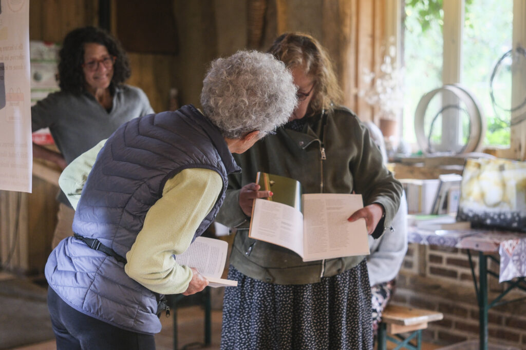 En préparant l’atelier, on laisse un peu de temps à la paysanne pour lire. Tout un monde, la Biblio nomade nous a rejoint avec d’autres livres.