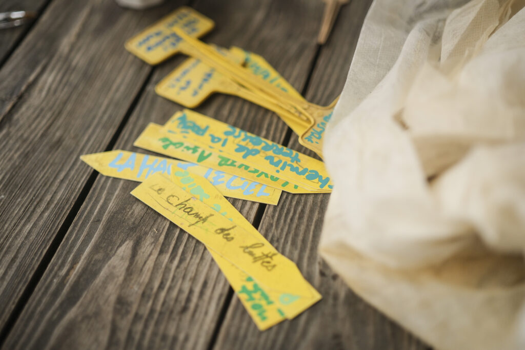 Le menu du dessert s’écrit au pocka sur des cartons de jus de pommes découpées. Ça écrit seule ou a plusieurs des slogans de révolte de la terre. L’humus pour les humains. …