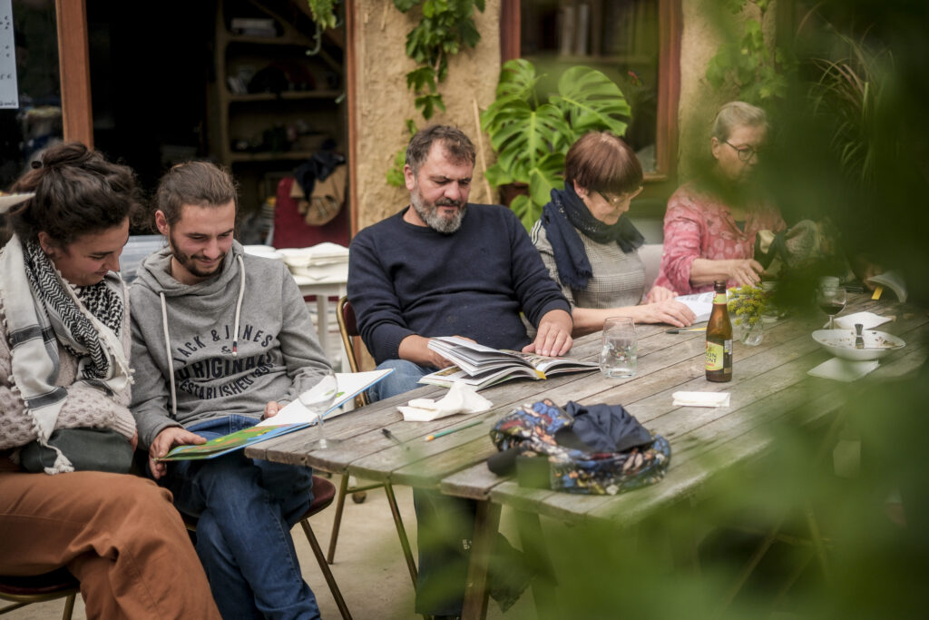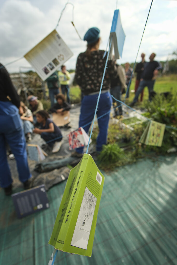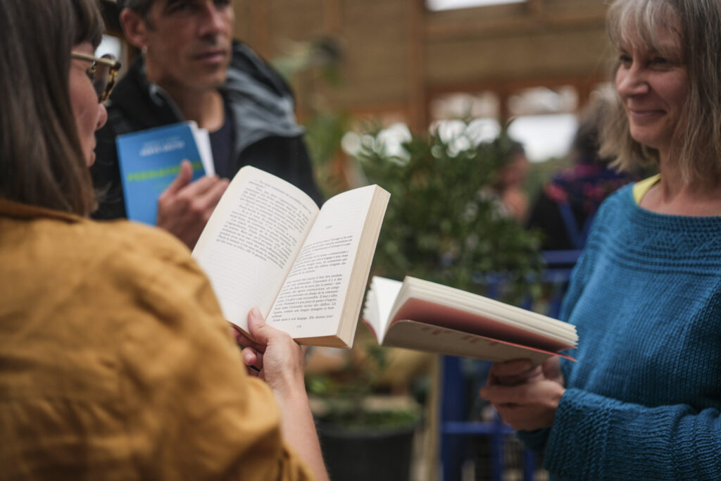 Tous les genres et générations échangent des livres en marchant. On se chuchote, déclame, conte des extraits. Les mots fusent du bar au canapé, de la terrasse aux tables débarrassées. Du manuel d’agronomie au champs d’insurrection des paysannes, de Claude Ponti au remembrement. Même le silence est chorale.