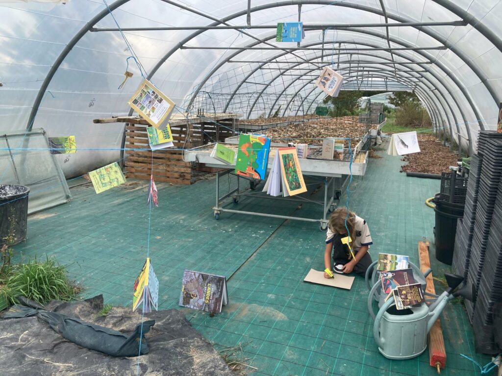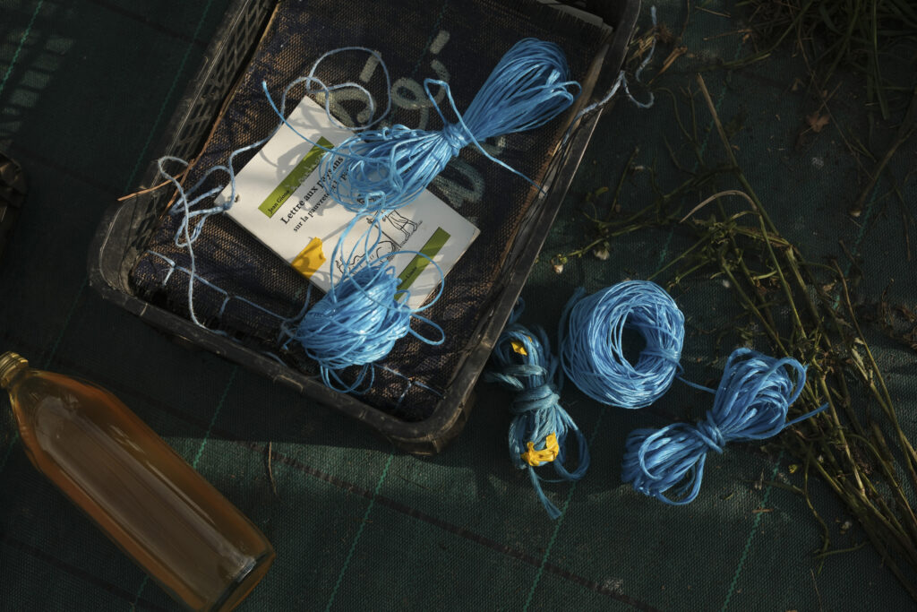 Le cortège du retour à la terre se met en marche vers la vallée. Une manifestation d’humains se faufile entre serres et poiriers. La ficelle bleue comme fil d’Ariane nous mène aux oignons qui sèchent entre les bouquins. Gabriela tire et imprime les portraits des personnes avec leurs livres à lire. Le soleil apparaît enfin.
